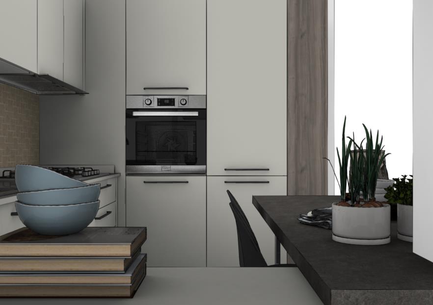 Un armonioso equilibrio tra bianco, alluminio e legno, per una cucina luminosa, ma in grado di trasmettere calore.